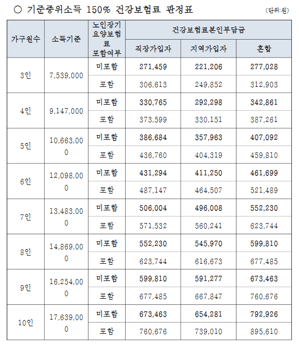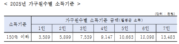 - 소득 기준 확인: 기준 중위소득 150%는 가구원 수에 따라 달라지므로, 복지로 소득 기준표에서 확인하시기 바랍니다.