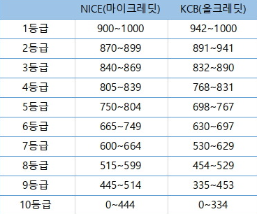 기존 등급제에서 점수제로 변경되어, 기존 신용등급에 따른 점수는 아래와 같습니다.