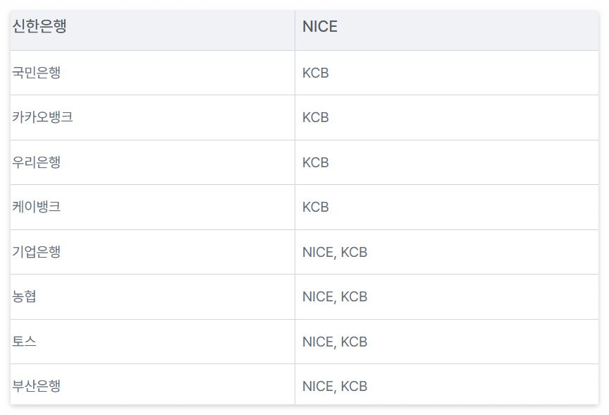 아래 표를 보시면, 두 개의 신용평가사를 함께 사용하는 경우도 있고 KCB 점수만을 사용하는 금융기관도 있습니다. 따라서 은행에서 신용대출을 받고자 한다면, KCB 신용점수를 더 높이는 것이 유리합니다.