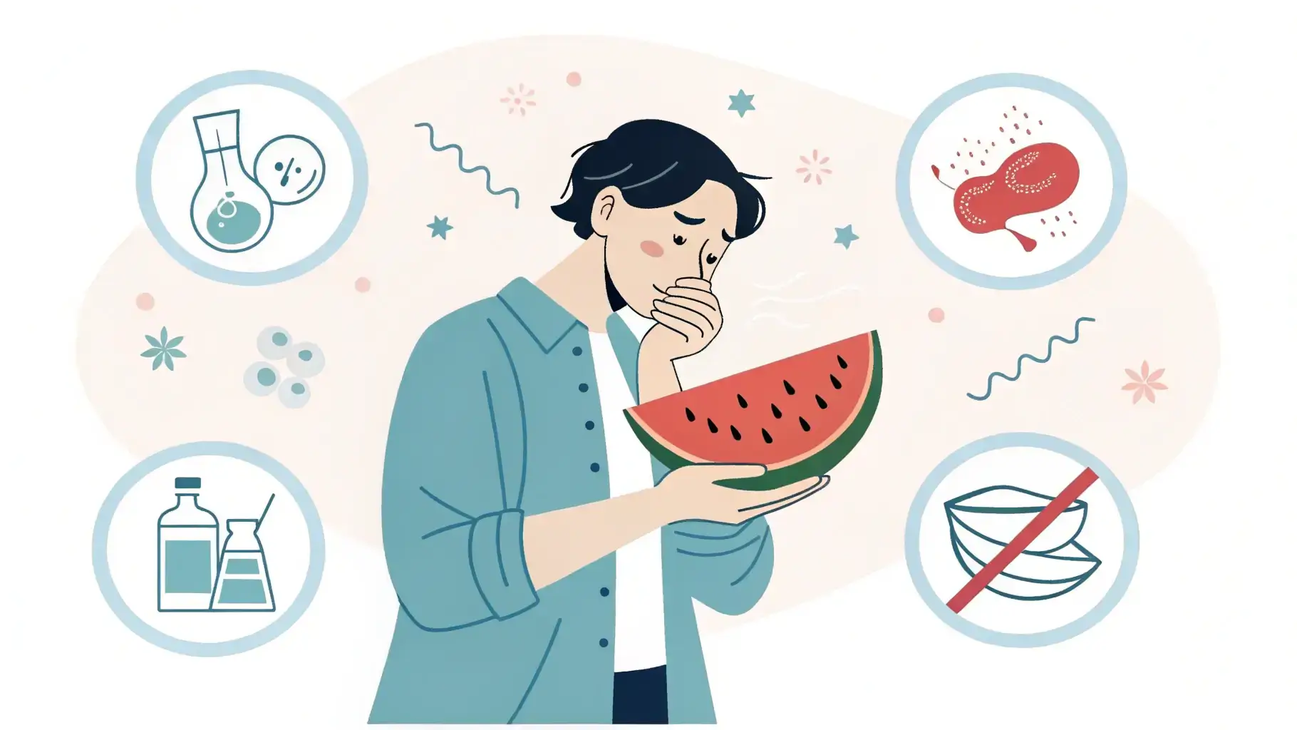 - 장염 시 주의: 장염으로 인한 설사나 복통이 있을 때 수박의 이뇨작용은 체내 수분 손실을 가중시킬 수 있으므로 섭취를 자제하는 것이 좋습니다. 가급적 수박 대신 물이나 이온 음료를 통해 수분을 보충하는 것이 효율적입니다.