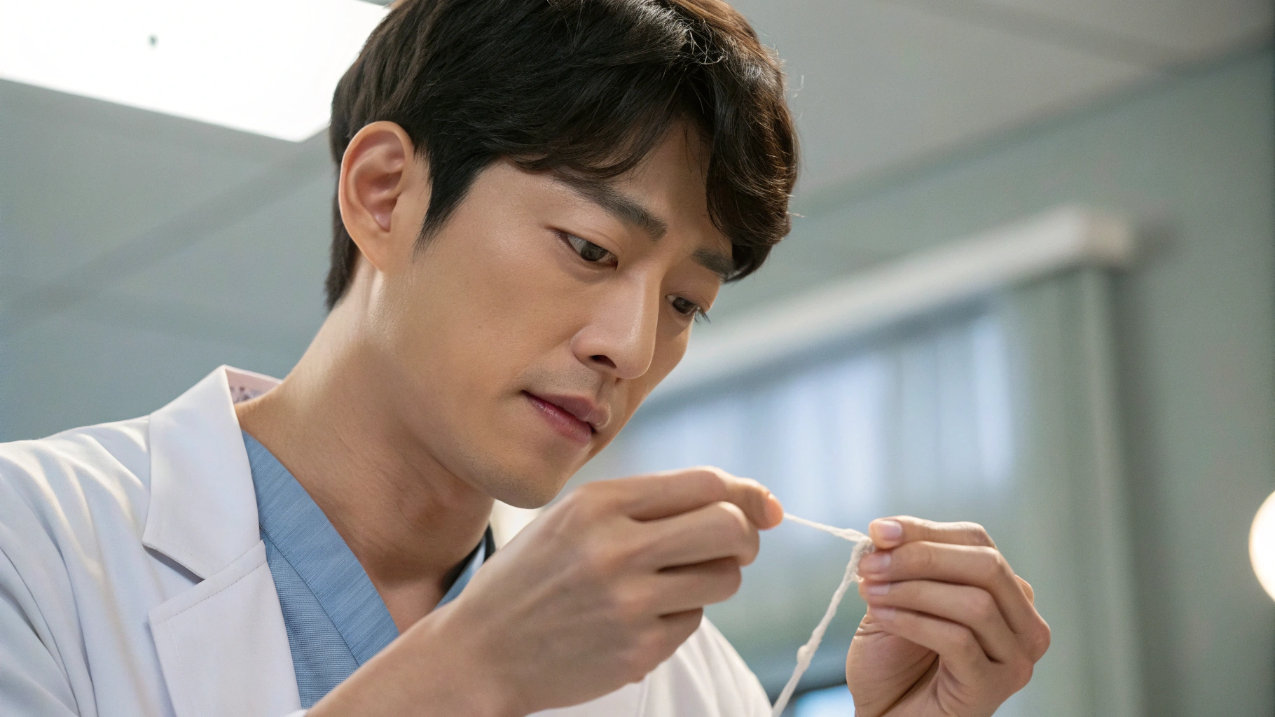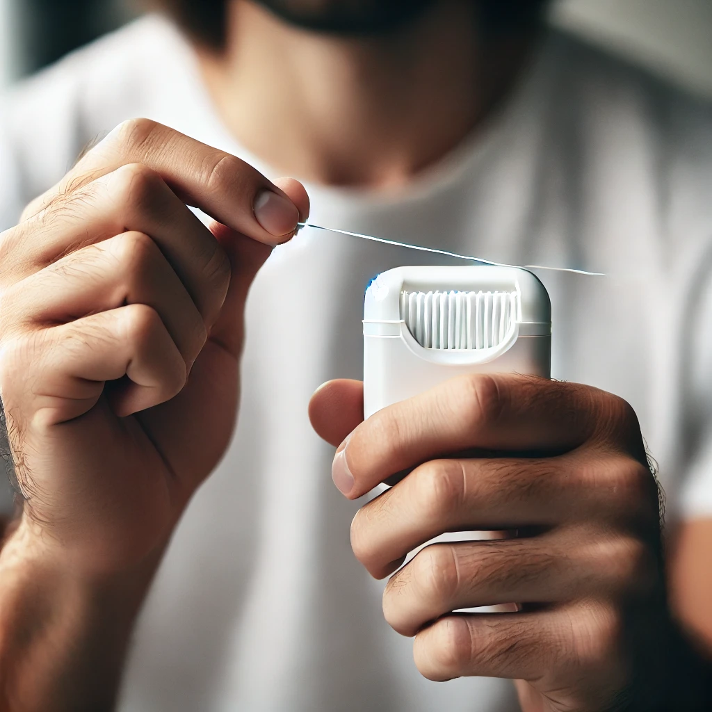 - 양손의 중지에 치실을 감고, 엄지와 검지로 2~3cm 정도의 치실을 잡습니다.